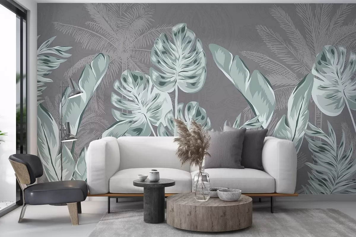 Fototapeta Duże, delikatne, turkusowe liście na stonowanym, szarym tle tworzą pogodną i eteryczną atmosferę Nr w08449v1
