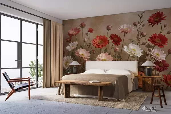 Fototapeta Pole kolorowych kwiatów przypominających stokrotki w różnych odcieniach różu, czerwieni i bieli na teksturowanym tle Nr w08462