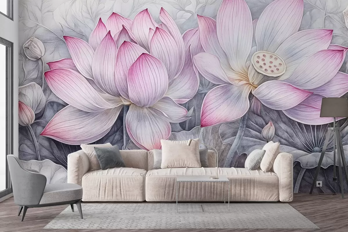 Fototapeta Kilka szczegółowo teksturowanych dużych różowych kwiatów lotosu z szaro-zielonymi liśćmi i łodygami na jasnym tle Nr w08465