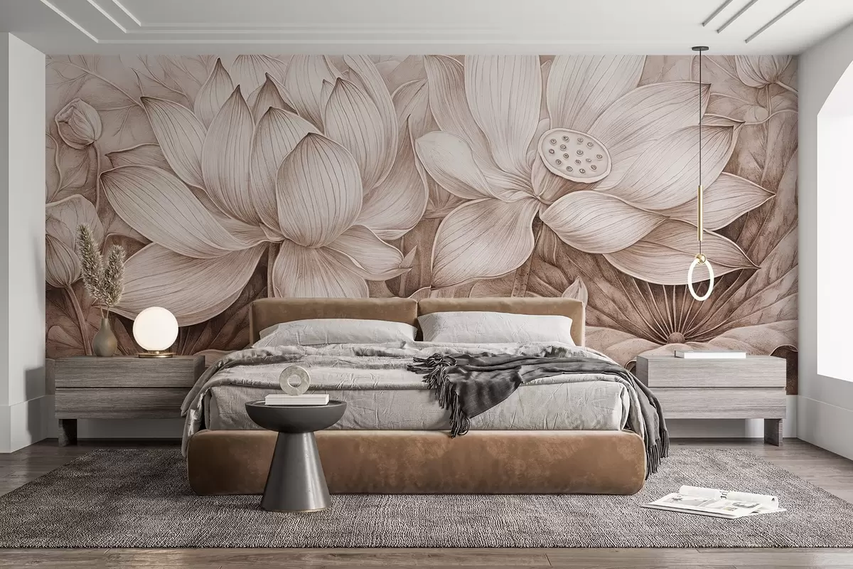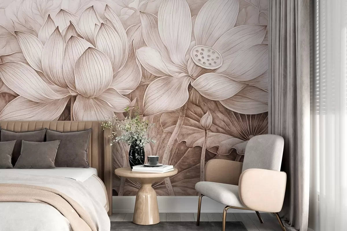 Fototapeta Kilka szczegółowo teksturowanych dużych beżowych kwiatów lotosu z brązowymi liśćmi i łodygami na jasnym tle Nr w08465v1