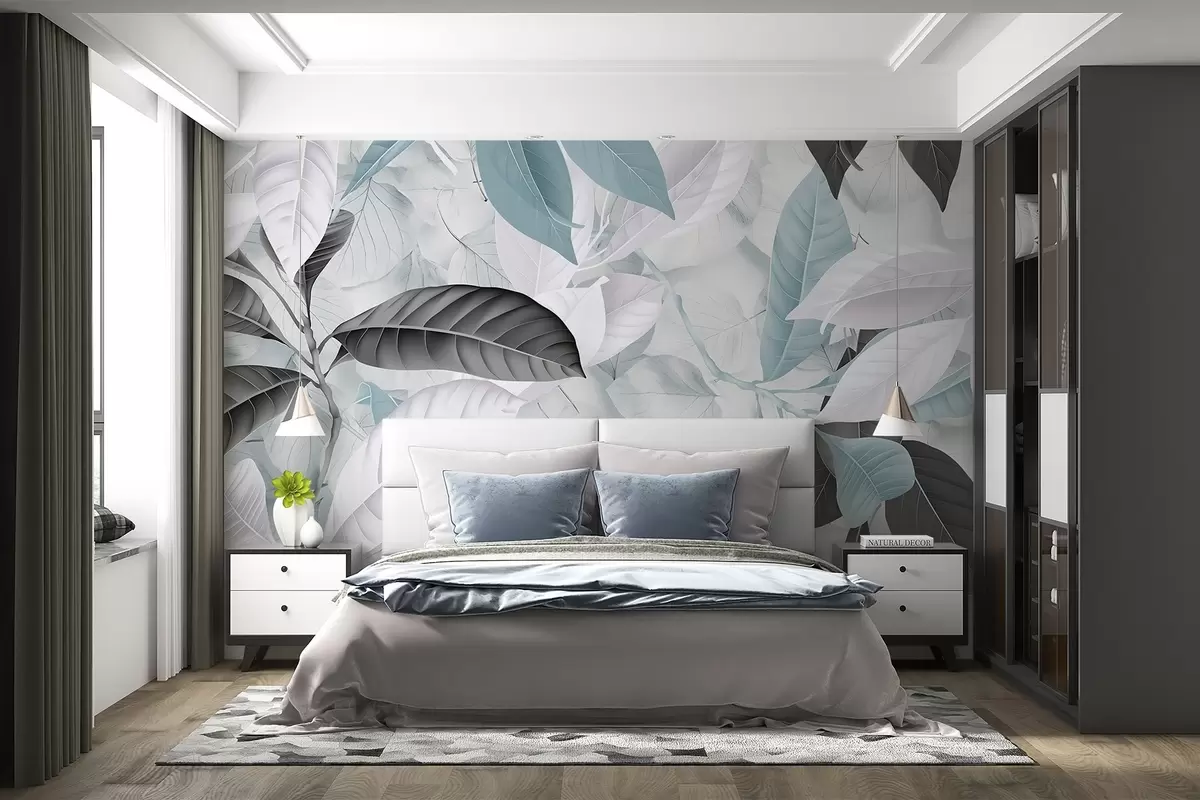 Fototapeta Duży nadruk niebieskich i szarych liści na jasnym tle o fakturze liści, tworzący bujny tropikalny klimat Nr w08468v1