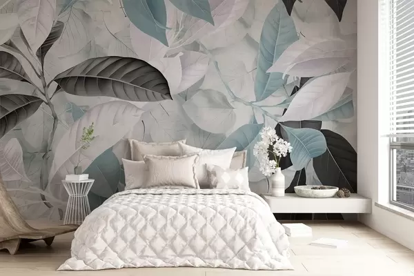 Fototapeta Duży nadruk niebieskich i szarych liści na jasnym tle o fakturze liści, tworzący bujny tropikalny klimat Nr w08468v1