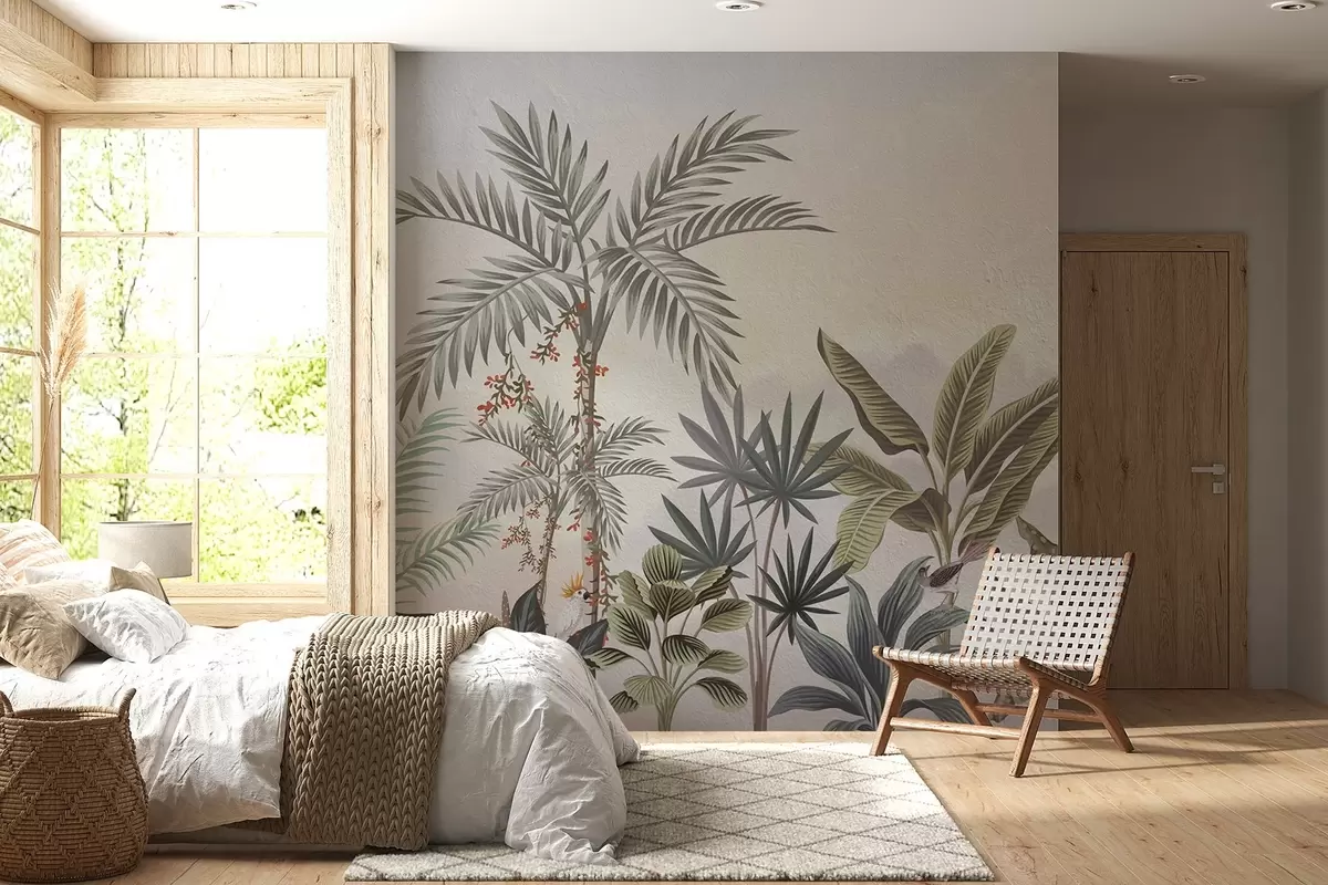 Fototapeta Tropikalna dżungla z palmami i kolorowymi ptakami Nr w08496