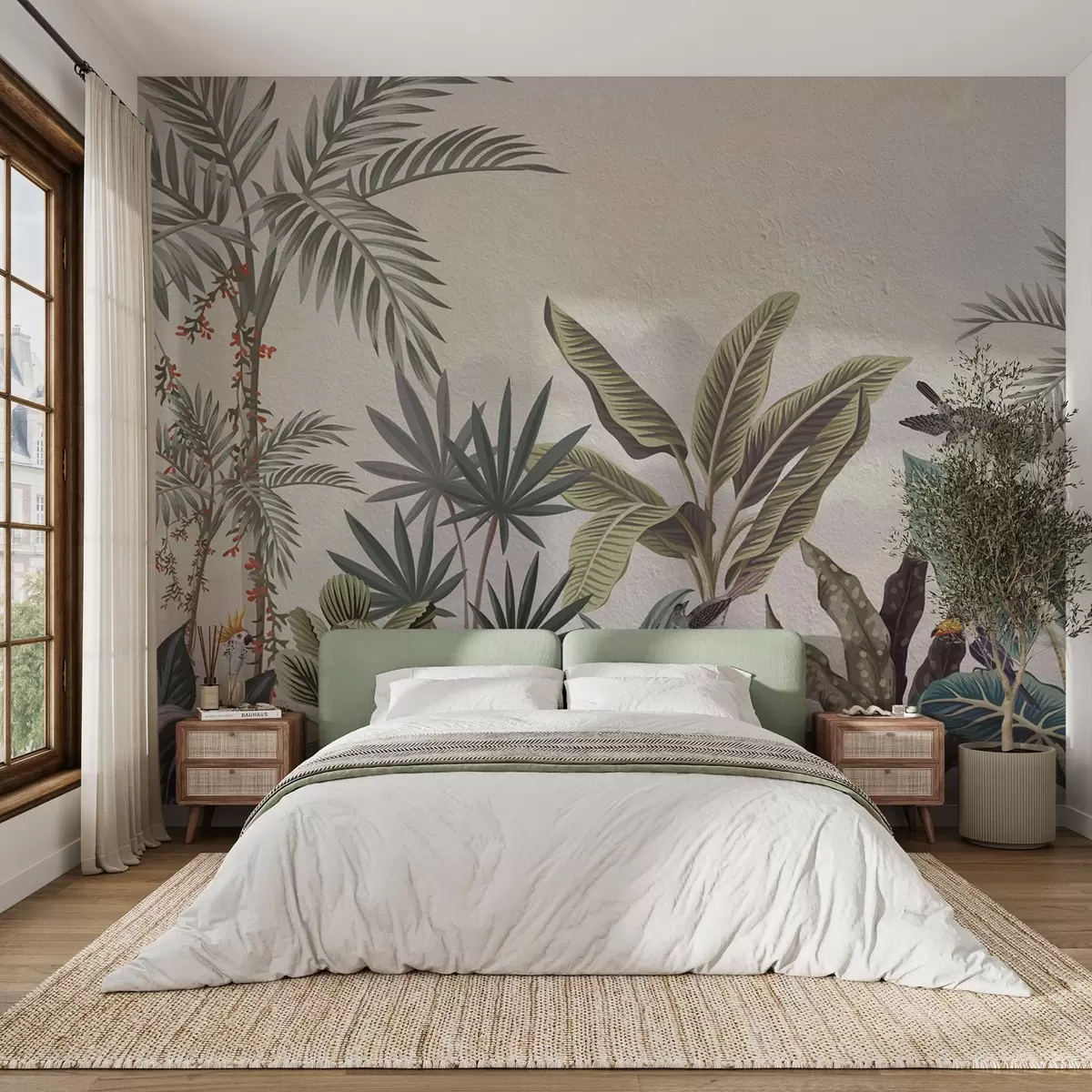 Fototapeta Tropikalna dżungla z palmami i kolorowymi ptakami Nr w08496