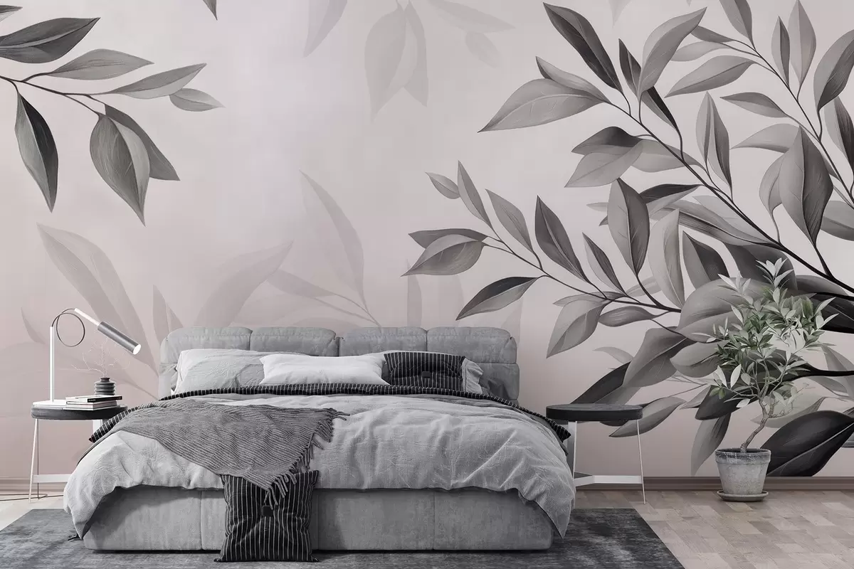 Fototapeta Ciemnoniebieskie gałęzie z liśćmi na szarym tle Nr w08499v1
