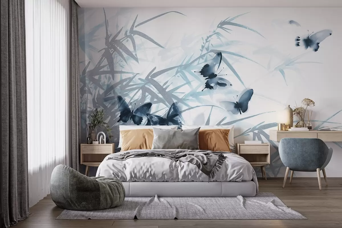 Fototapeta Teksturowane liście i łodygi bambusa z latającymi niebieskimi motylami z przezroczystymi skrzydłami Nr w08524