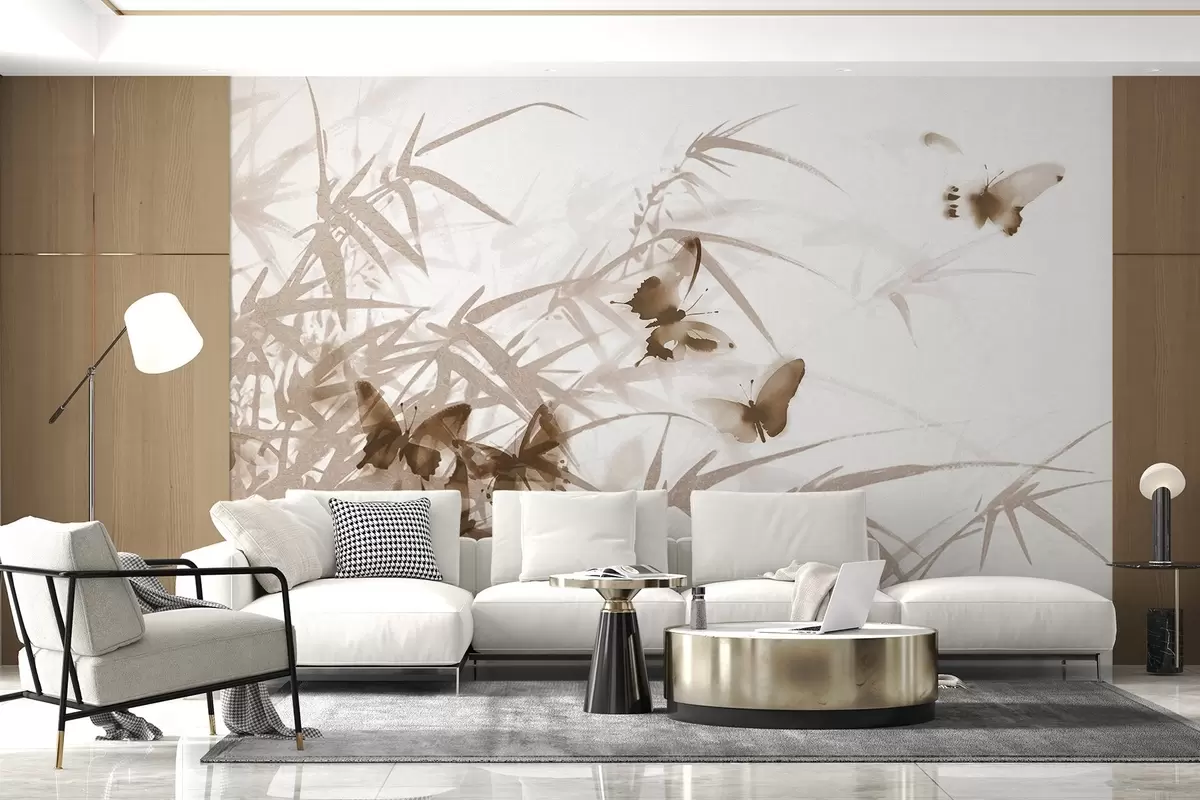 Fototapeta Teksturowane liście i łodygi bambusa z latającymi brązowymi motylami z przezroczystymi skrzydłami Nr w08524v1