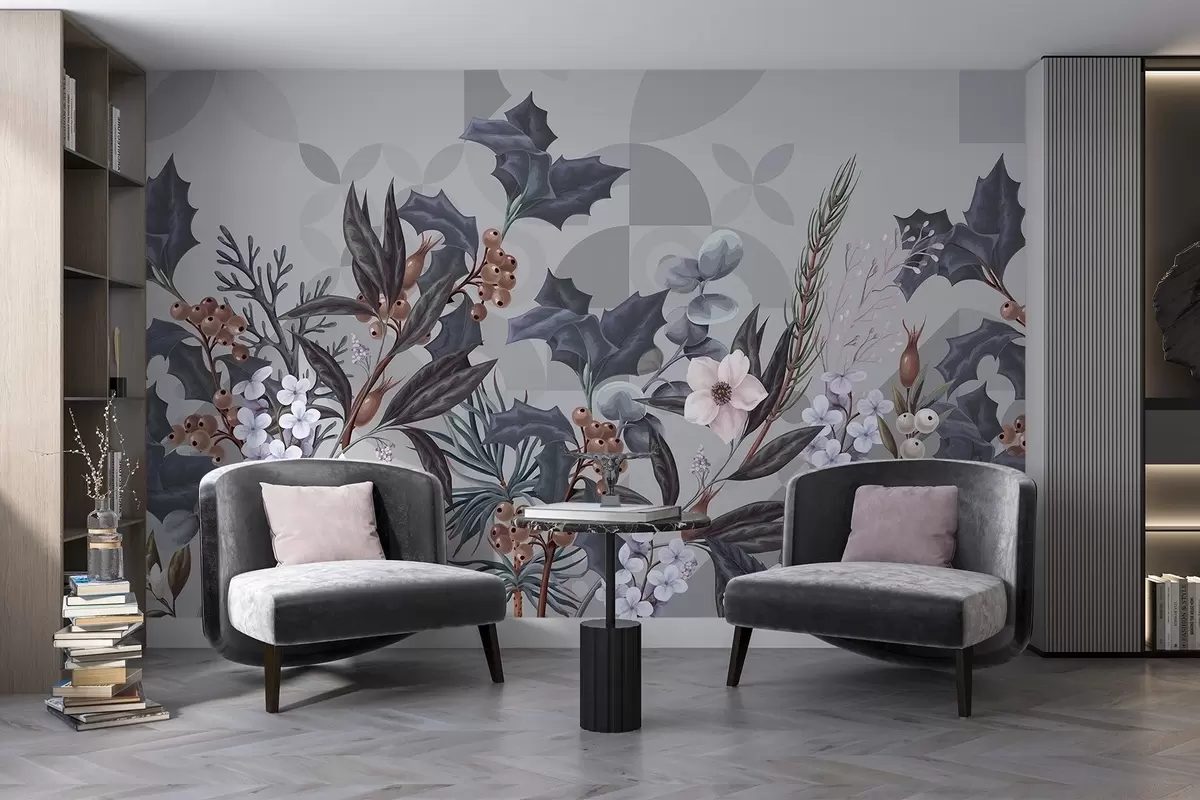Fototapeta Kompozycja kwiatowa z dużymi ciemnymi liśćmi, kwiatami i jagodami na stonowanym szarym geometrycznym abstrakcyjnym tle Nr w08525