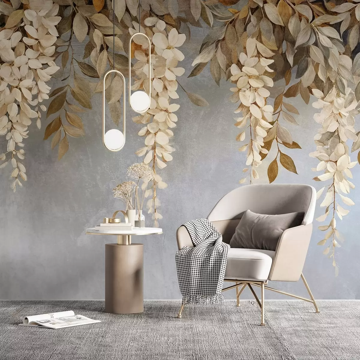 Fototapeta Delikatne białe i jasnobeżowe kwiaty glicynii z liśćmi spływającymi kaskadowo w dół na miękkim szarym tle Nr w08531