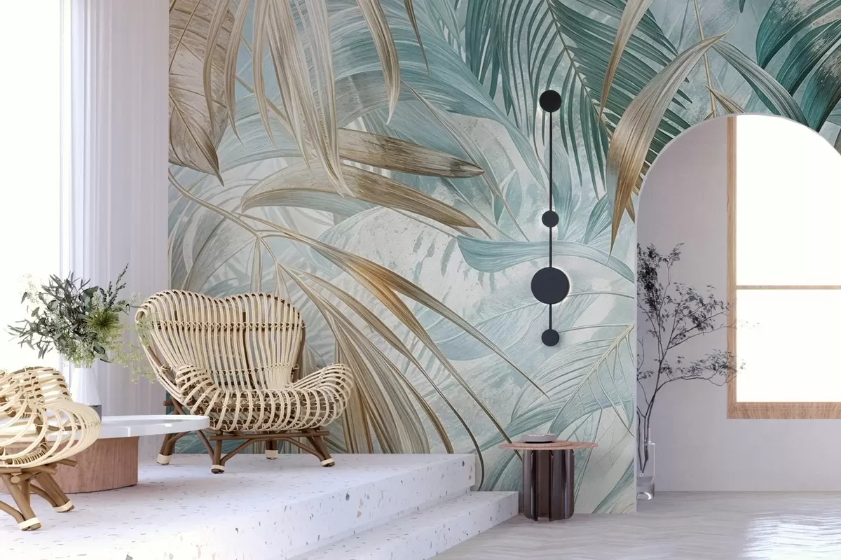 Fototapeta Tropikalny abstrakcyjny kwiatowy nadruk z dużymi liśćmi palmowymi w odcieniach niebieskiego i beżu tworzy bujną atmosferę Nr w08532