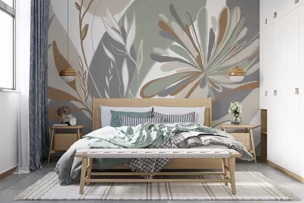 Fototapeta Abstrakcyjny kwiatowy minimalistyczny nadruk ze stylizowanymi liśćmi i płatkami w odcieniach zieleni, szarości i beżu Nr w08536