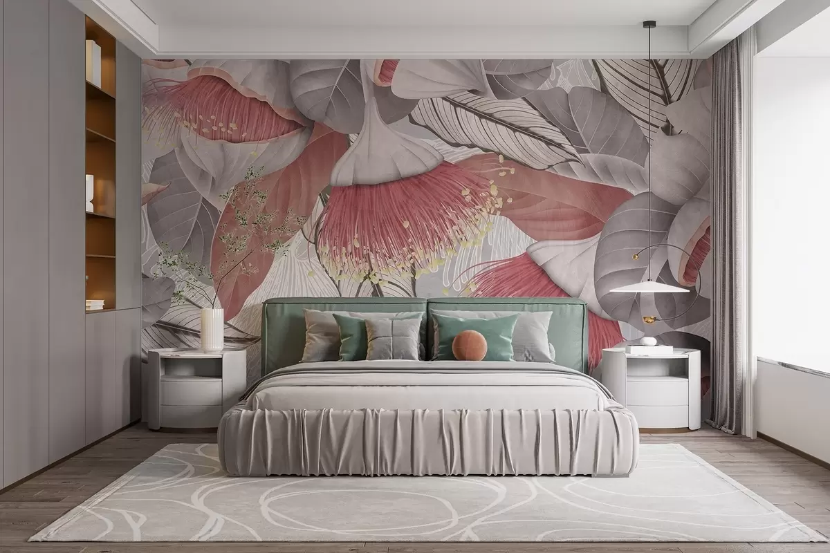 Fototapeta Botaniczna ilustracja dużych kwiatów eukaliptusa z długimi pręcikami na szaro-białym tle Nr w08539