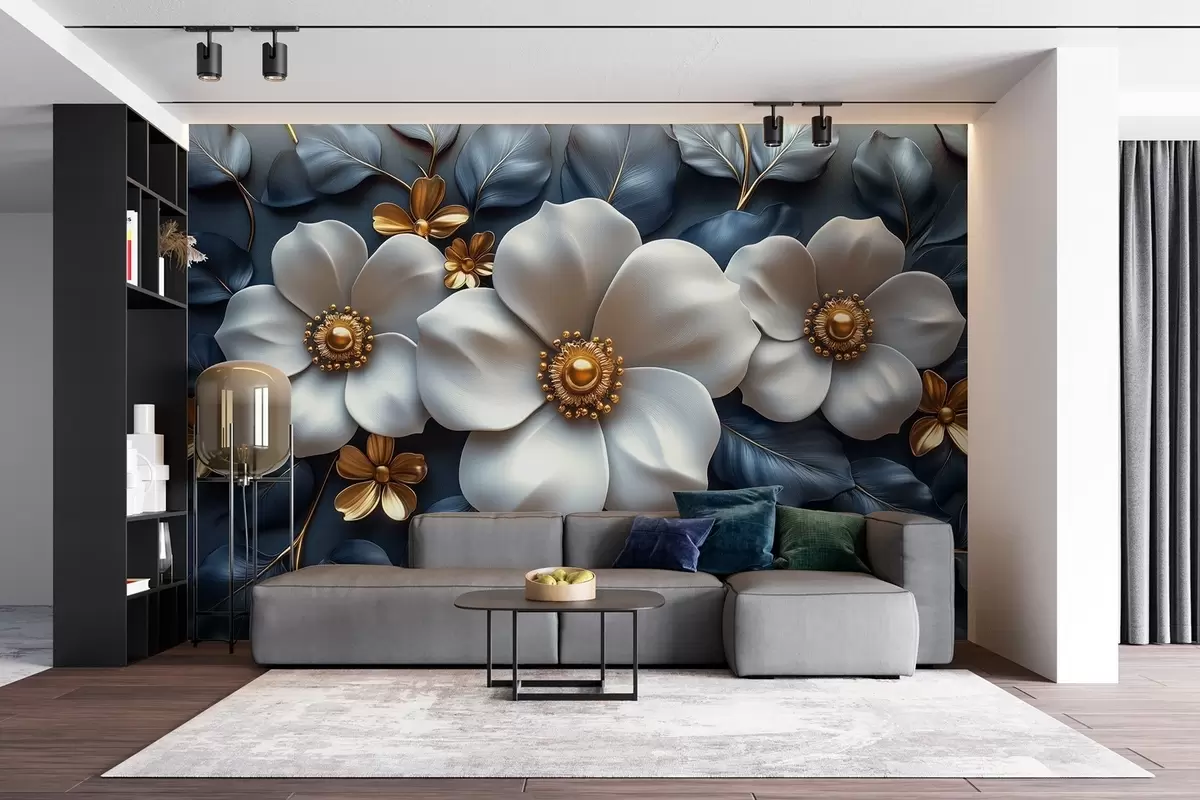 Fototapeta Duże białe kwiaty na eleganckim niebieskim tle z liśćmi Nr w08559