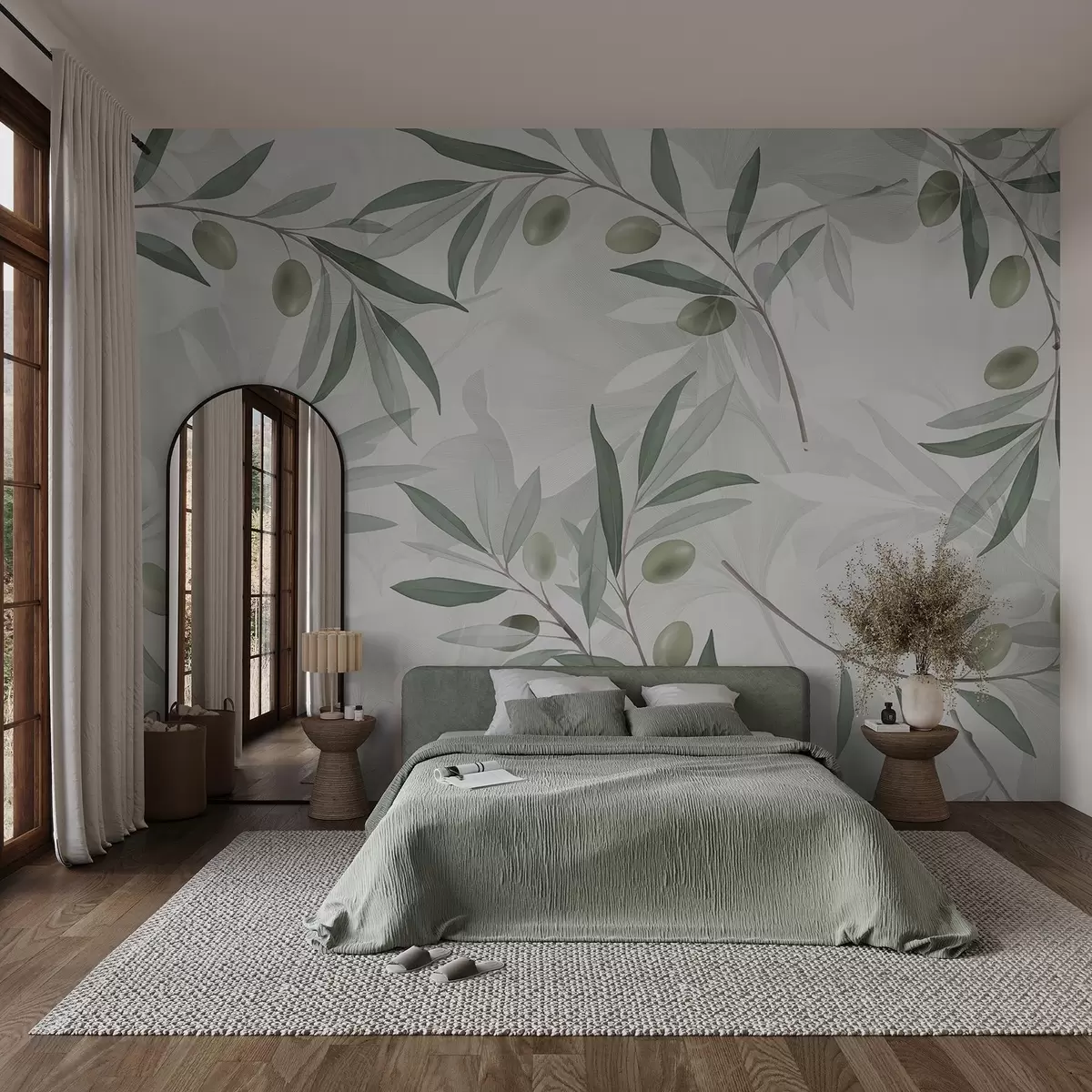 Fototapeta Gałązki oliwne z zielonymi liśćmi i oliwkami na jasnym tle Nr w08576