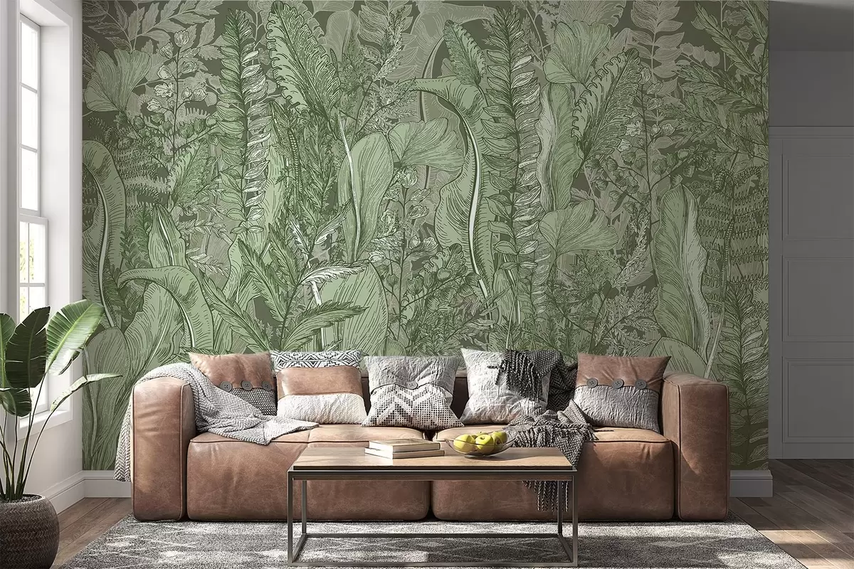 Fototapeta Bujny, zielony las z różnymi rodzajami paproci, liści i listowia w odcieniach zieleni Nr w08579