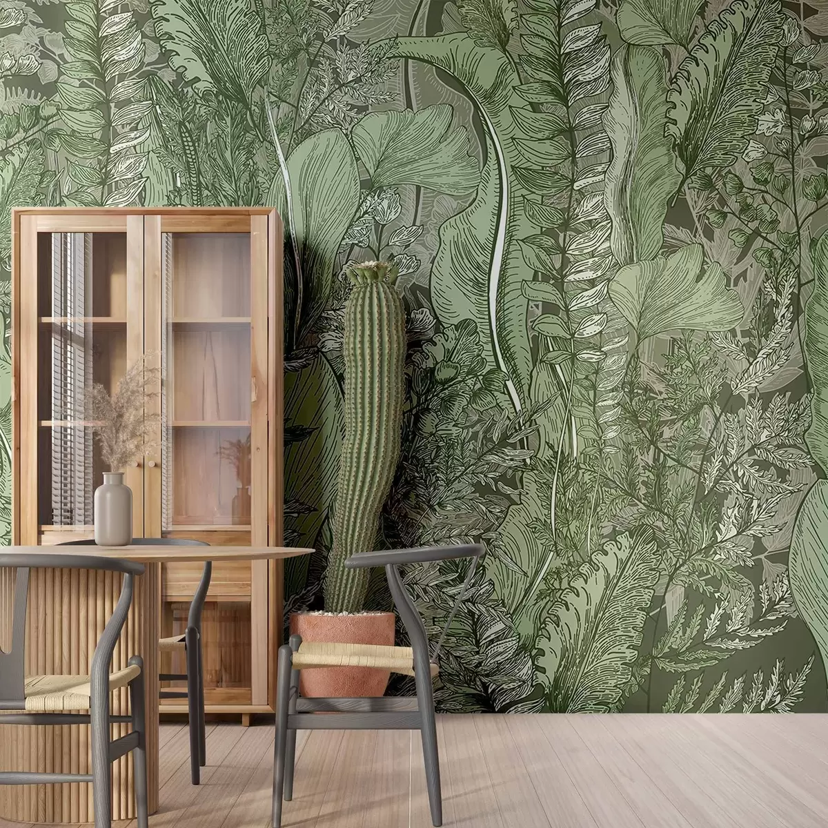 Fototapeta Bujny, zielony las z różnymi rodzajami paproci, liści i listowia w odcieniach zieleni Nr w08579