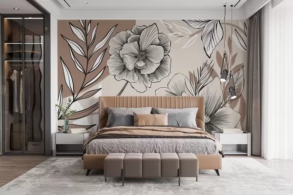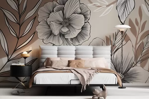 Fototapeta Duże czarno-białe graficzne kwiaty ze szczegółowymi liśćmi na beżowym abstrakcyjnym tle Nr w08580