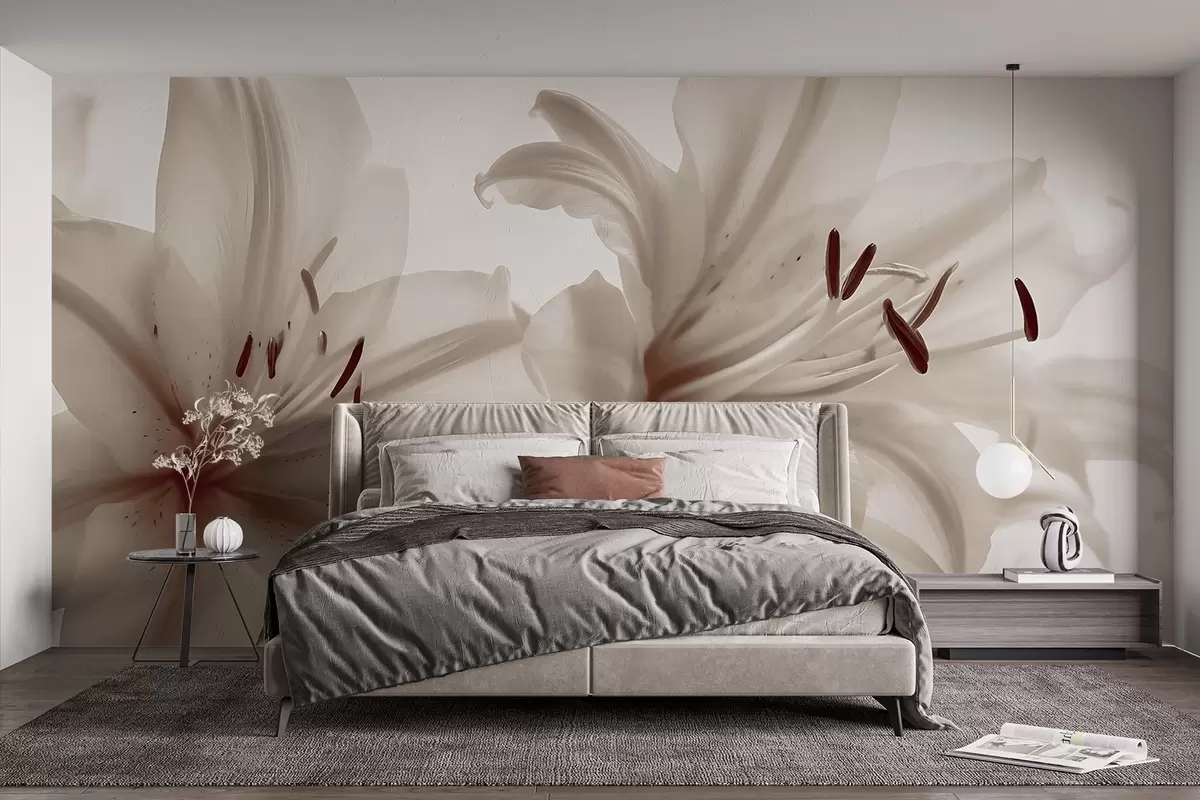 Fototapeta Miękkie zbliżenie beżowych minimalistycznych kwiatów lilii na jasnym tle Nr w08586v1