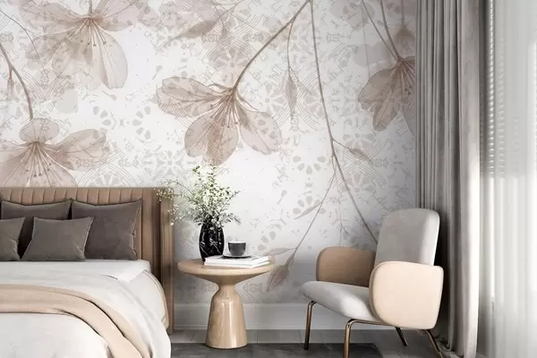 Fototapeta Delikatne beżowe i białe kwiaty z długimi łodygami i płatkami na miękkim, rozmytym teksturowanym tle Nr w08588v1