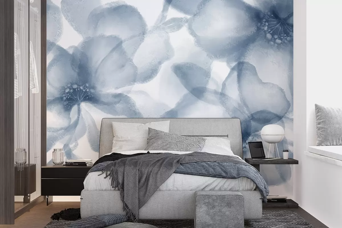 Fototapeta Miękkie, rozmyte abstrakcyjne niebieskie kwiaty tworzą spokojny i uspokajający kwiatowy nadruk Nr w08607