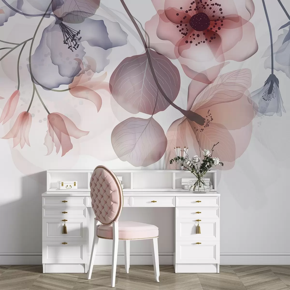 Fototapeta Delikatne różowe i szare półprzezroczyste kwiaty z miękkimi płatkami i ciemnymi środkami, na jasnym tle Nr w08613