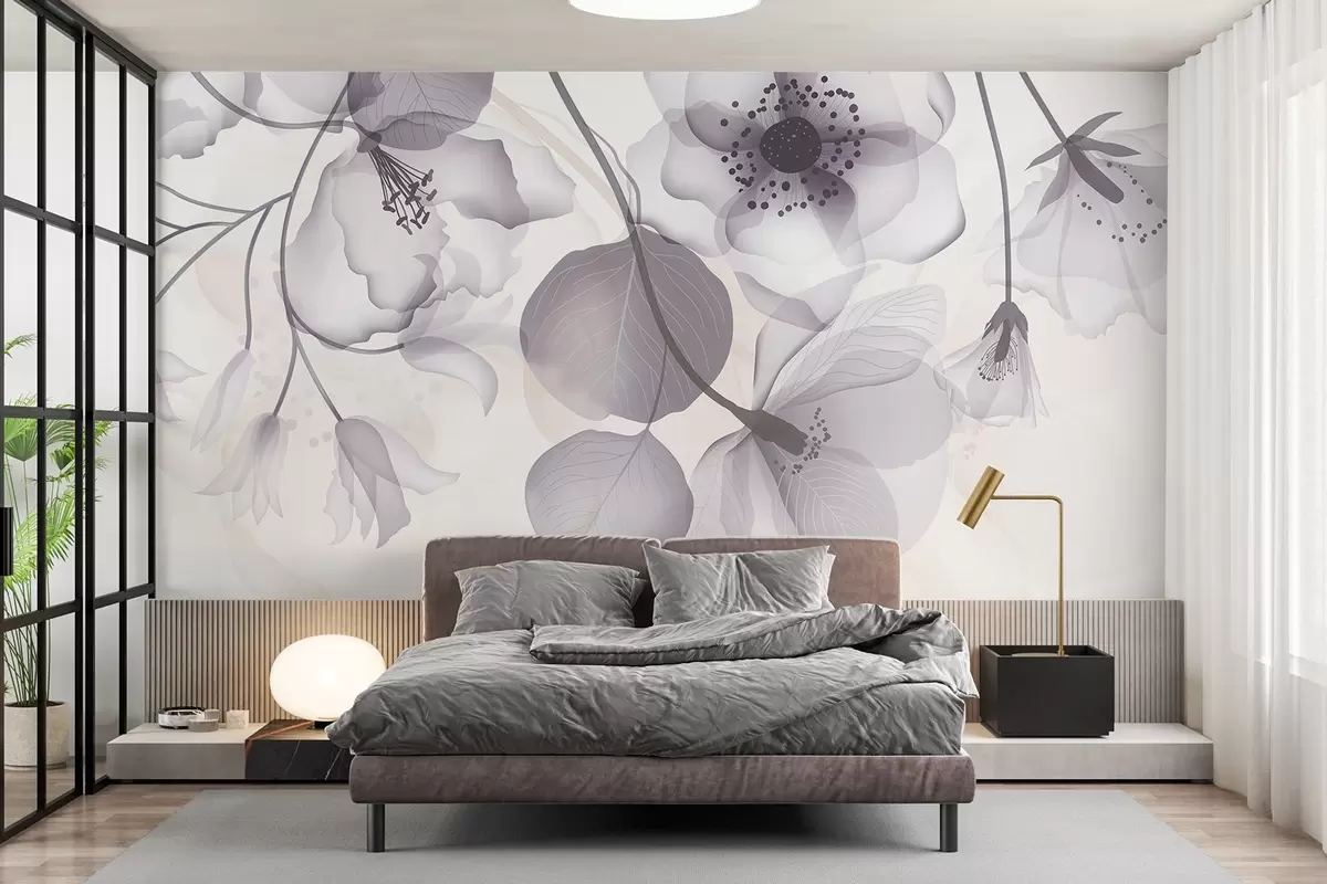 Fototapeta Delikatne szare i beżowe półprzezroczyste kwiaty z miękkimi płatkami i ciemnymi środkami, na jasnym tle Nr w08613v2