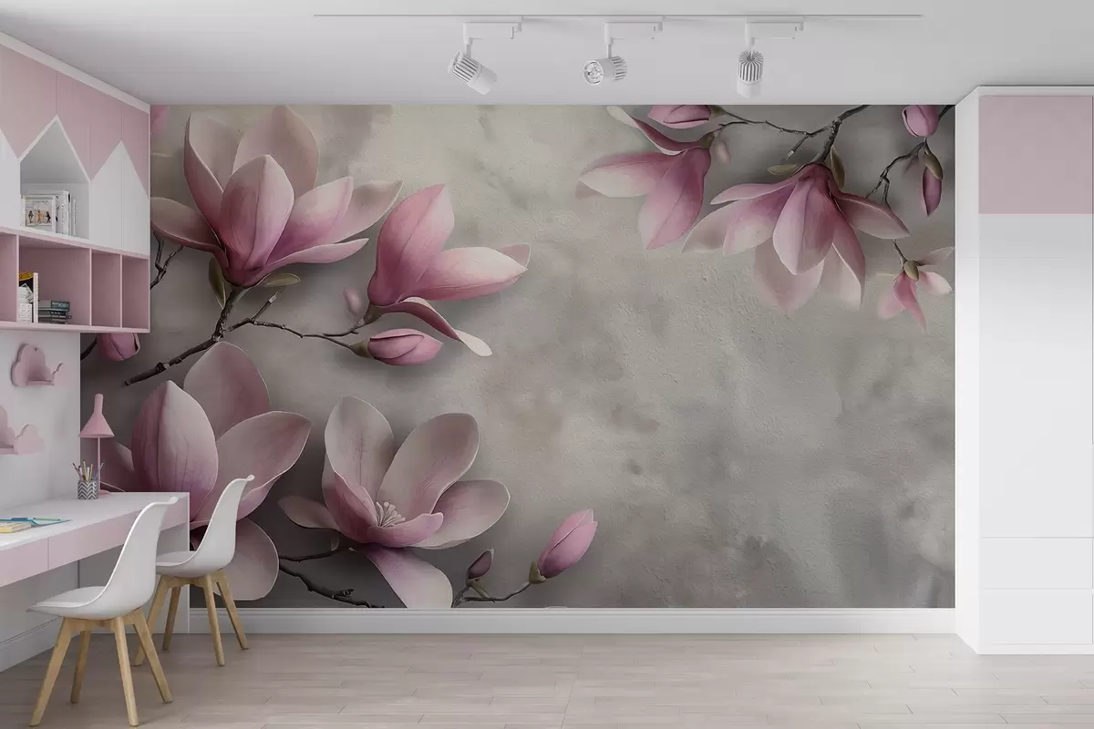 Fototapeta Delikatne różowe magnolie na betonowej ścianie w odcieniach szarości Nr w08636v1