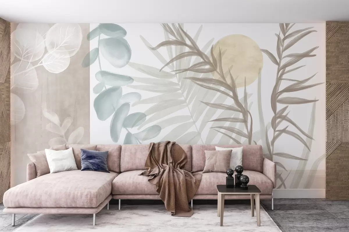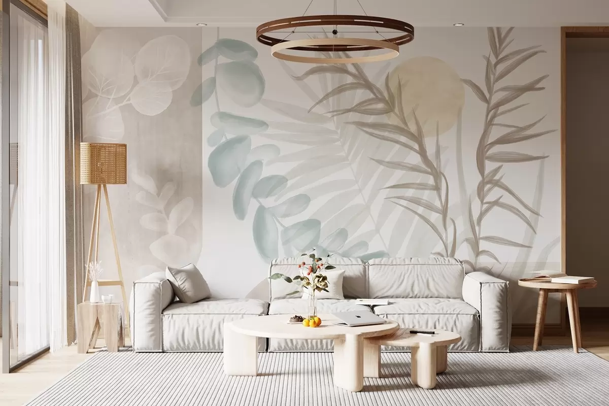 Fototapeta Minimalistyczny abstrakcyjny nadruk ze stylizowanymi liśćmi i eukaliptusem o miękkich, beżowych organicznych kształtach w stonowanych pastelowych kolorach Nr w08648