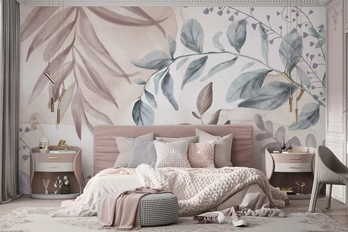 Fototapeta Botaniczny nadruk z liśćmi i kwiatowymi gałązkami w delikatnych pastelowych kolorach, na akwarelowym tle Nr w08668