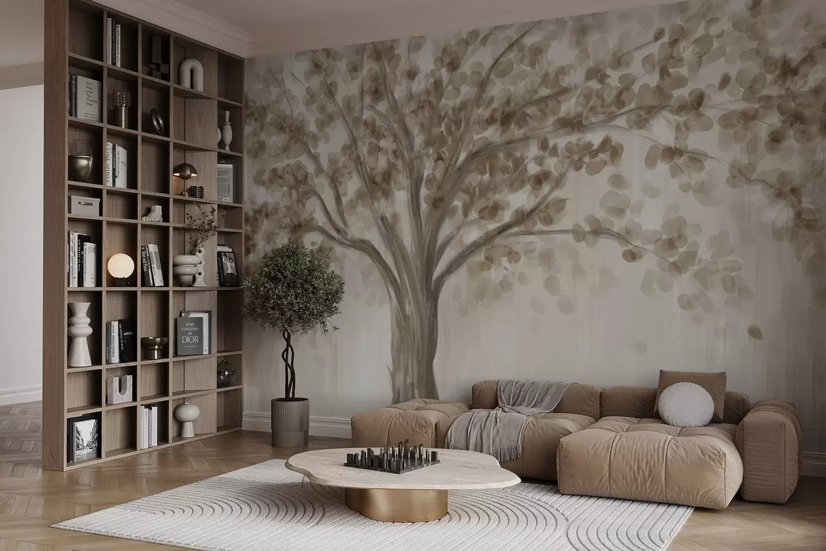 Fototapeta Duże drzewo z miękkimi, abstrakcyjnymi liśćmi w kolorze beżowym na jasnym, neutralnym tle podkreślającym odcienie drzewa Nr w08669