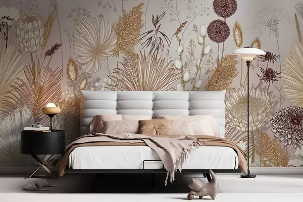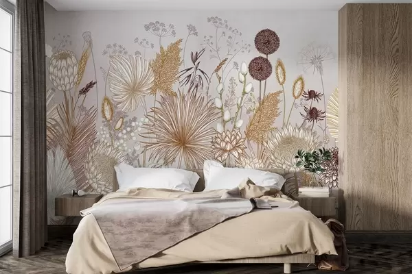 Fototapeta Kwiaty i rośliny w ciepłych odcieniach beżu w stylu botanicznym, prezentujące różnorodne kształty i tekstury Nr w08672