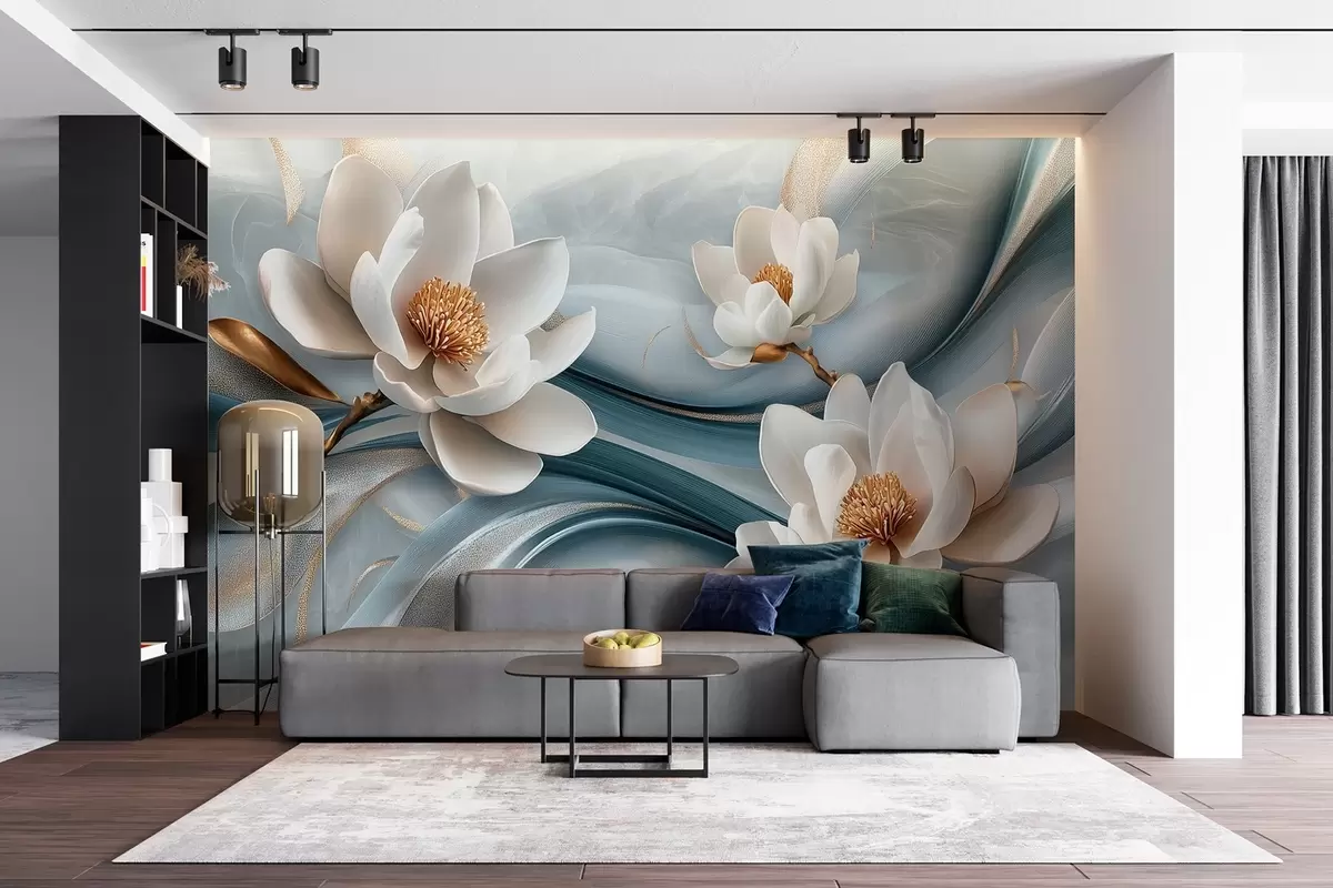 Fototapeta Kwiaty magnolii w połączeniu z niebieskimi, białymi i żółtymi odcieniami z abstrakcyjnymi falami Nr w08695