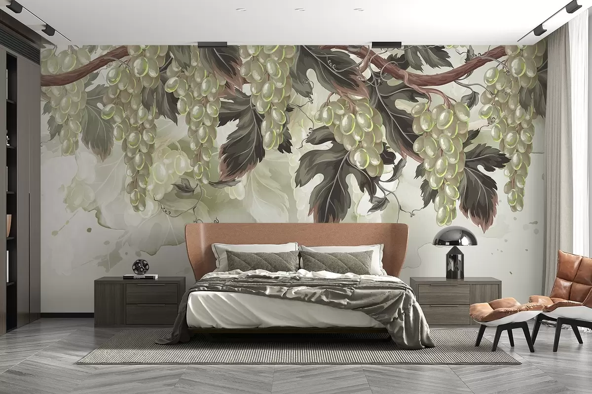 Fototapeta Winogrona wiszące na winorośli z zielonymi liśćmi, na jasnym tle z teksturą przypominającą akwarelę Nr w08696