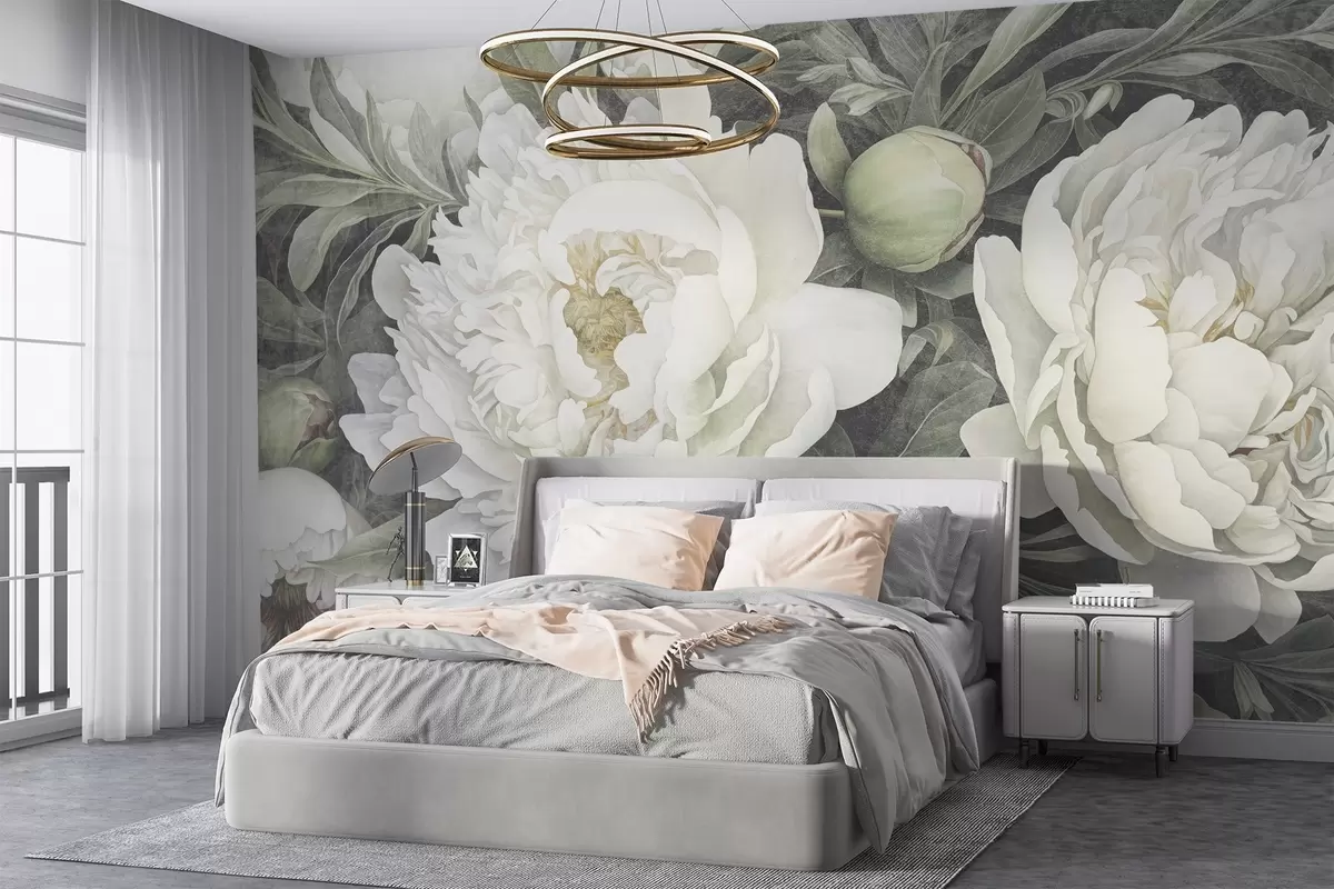 Fototapeta Teksturowane pastelowe białe piwonie z miękkimi zielonymi pąkami i liśćmi z delikatnymi płatkami Nr w08697