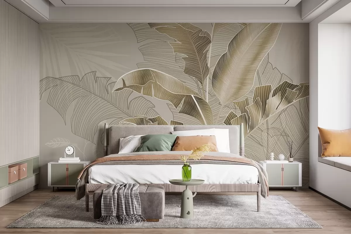 Fototapeta Harmonijna kompozycja tropikalnych liści w odcieniach beżu i brązu ze szczegółową kreską Nr w08698