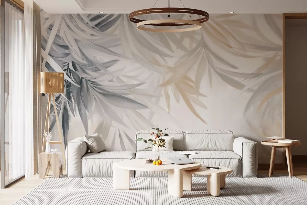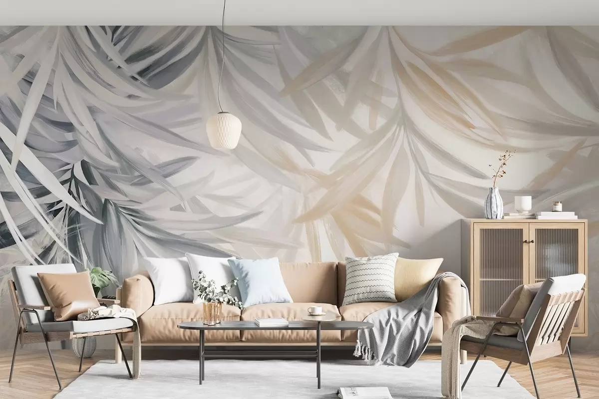 Fototapeta Miękkie, płynne, jasne liście tropikalne w odcieniach szarości i brzoskwini, wtapiające się w blady, neutralny nadruk Nr w08703