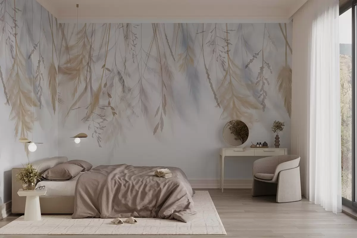 Fototapeta Delikatne trawy, kłosy i rośliny w pastelowych odcieniach, ułożone w kaskadowy nadruk na jasnym tle Nr w08737