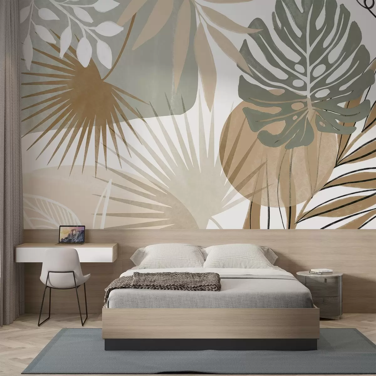 Fototapeta Abstrakcyjny wzór przedstawiający różne tropikalne liście w ziemistych odcieniach zieleni, beżu i kremu Nr w08738v1