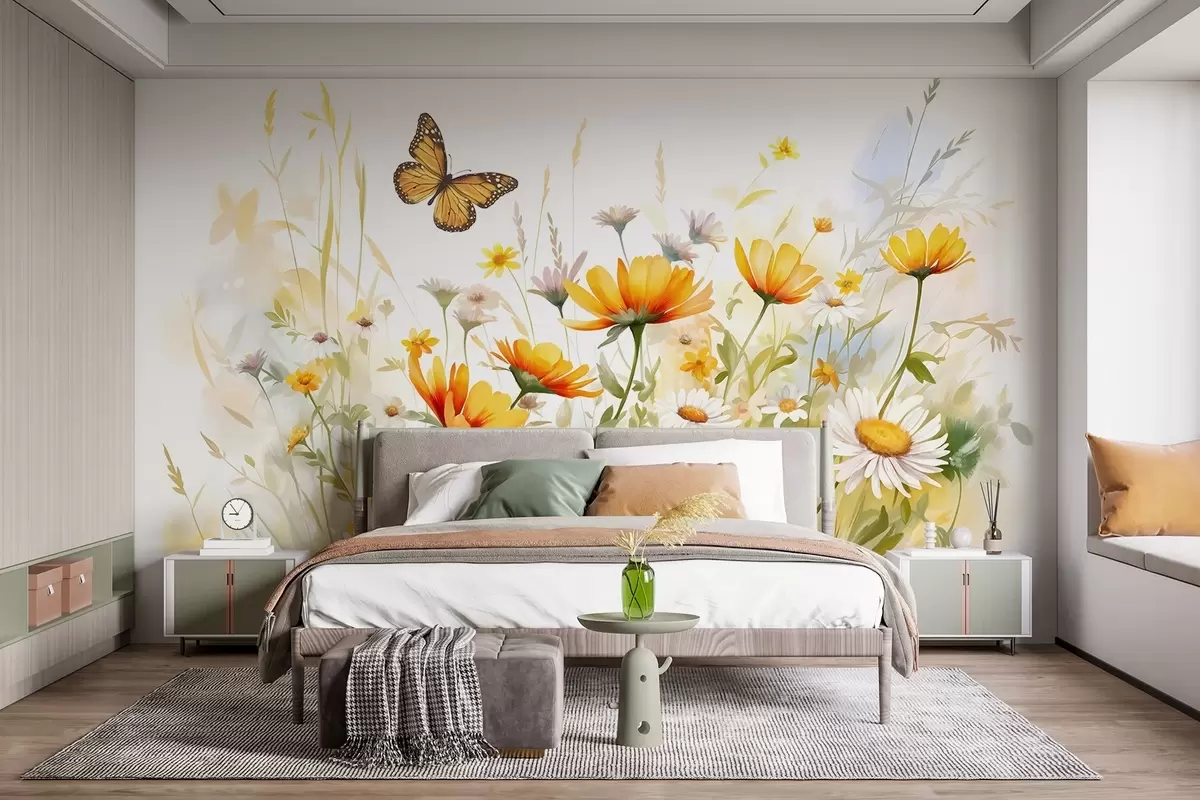 Fototapeta Żywe, akwarelowe pole kwiatów z pomarańczowymi i żółtymi kwiatami z motylem nad kwiatami Nr w08739