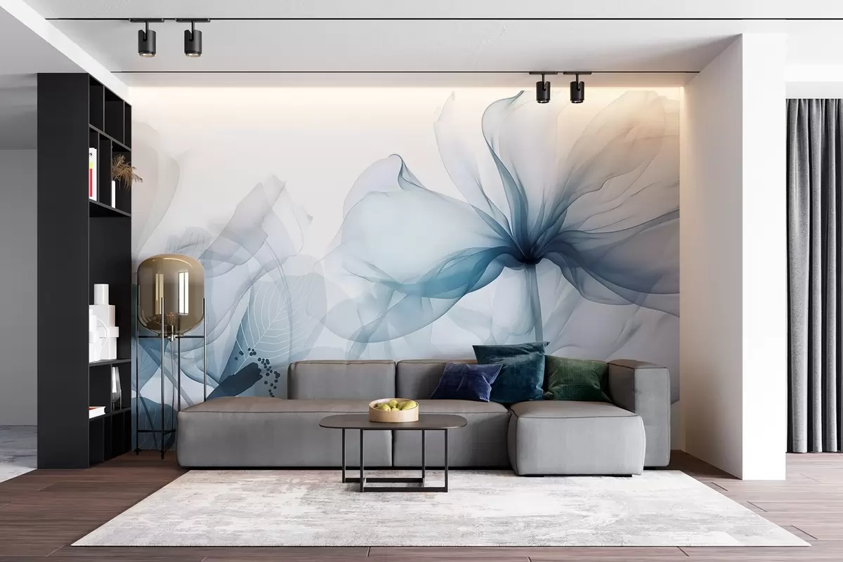 Fototapeta Niebieskie abstrakcyjne kwiaty z miękkimi, półprzezroczystymi płatkami i delikatnymi detalami na białym tle Nr w08742