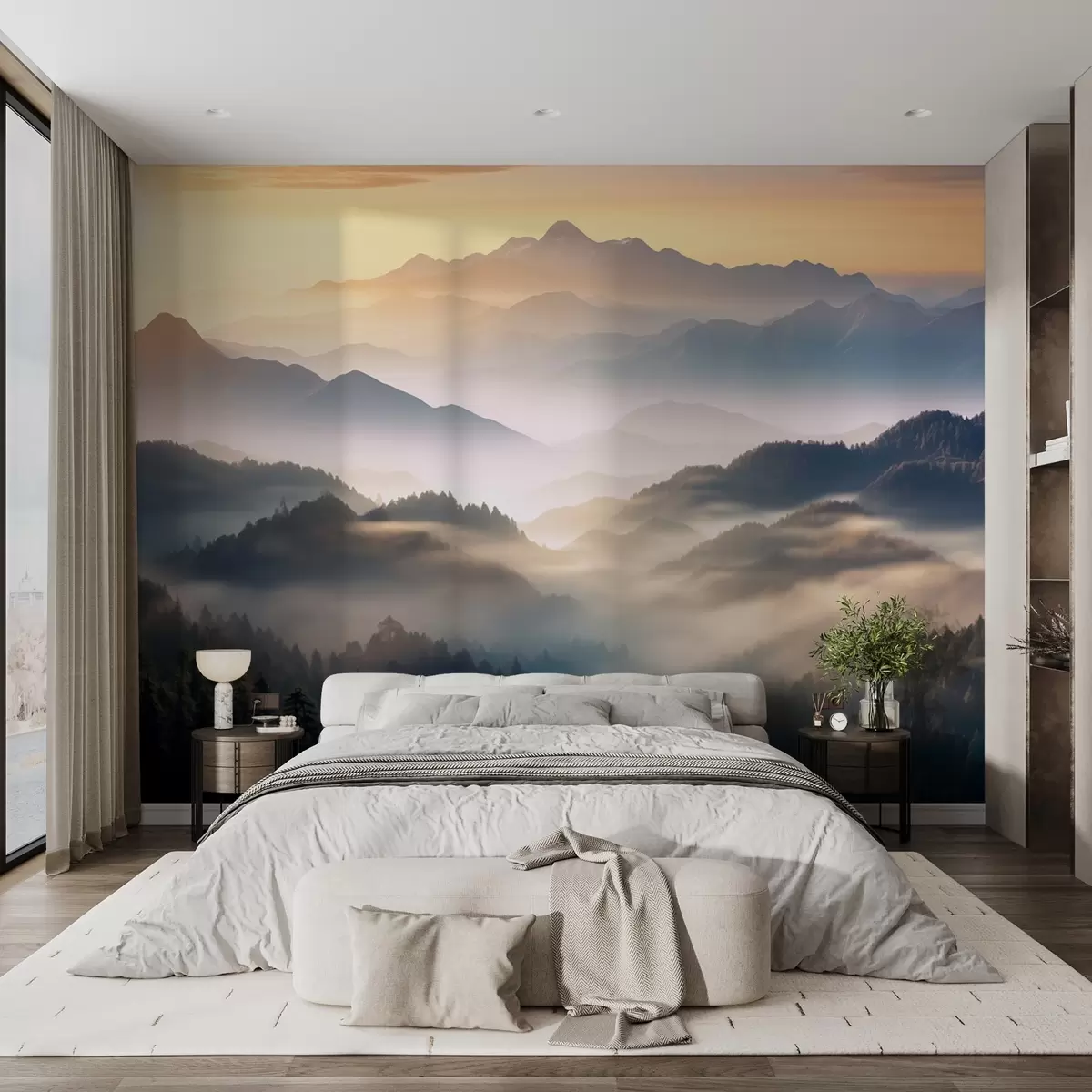 Fototapeta Spokojny górski krajobraz o świcie, z delikatną mgłą otulającą sosny Nr w08748