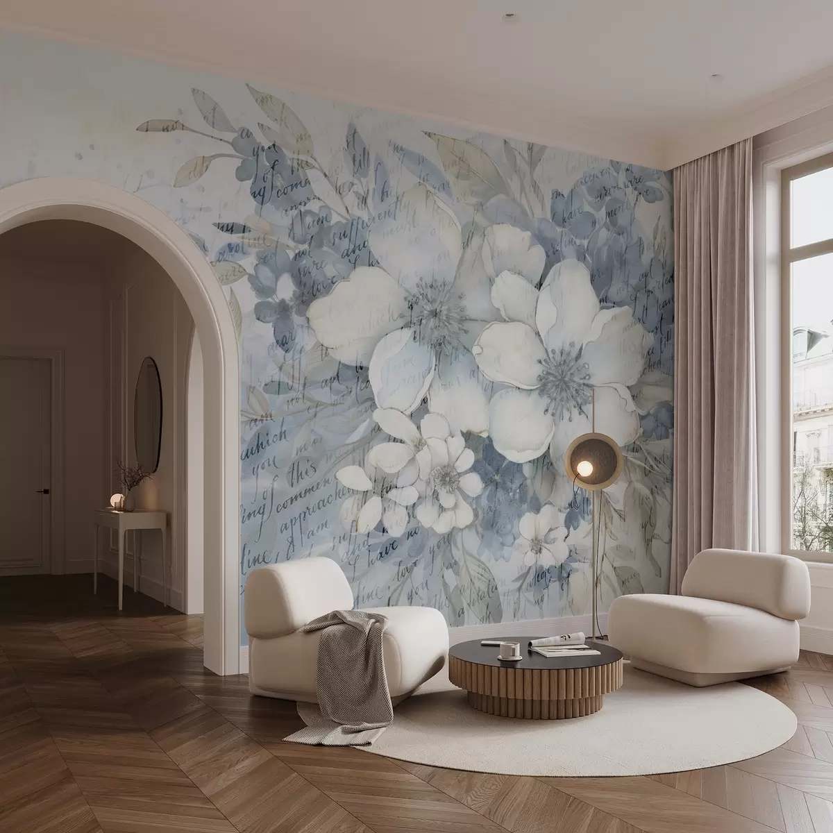 Fototapeta Miękka imitacja ściany z teksturą białych i niebieskich kwiatów na jasnym tle z niewyraźnym odręcznym tekstem Nr w08771