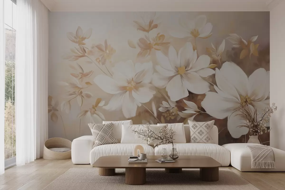Fototapeta Malowane na biało kwiaty z miękkimi płatkami i delikatnymi liśćmi na jasnobeżowym i kremowym tle Nr w08780
