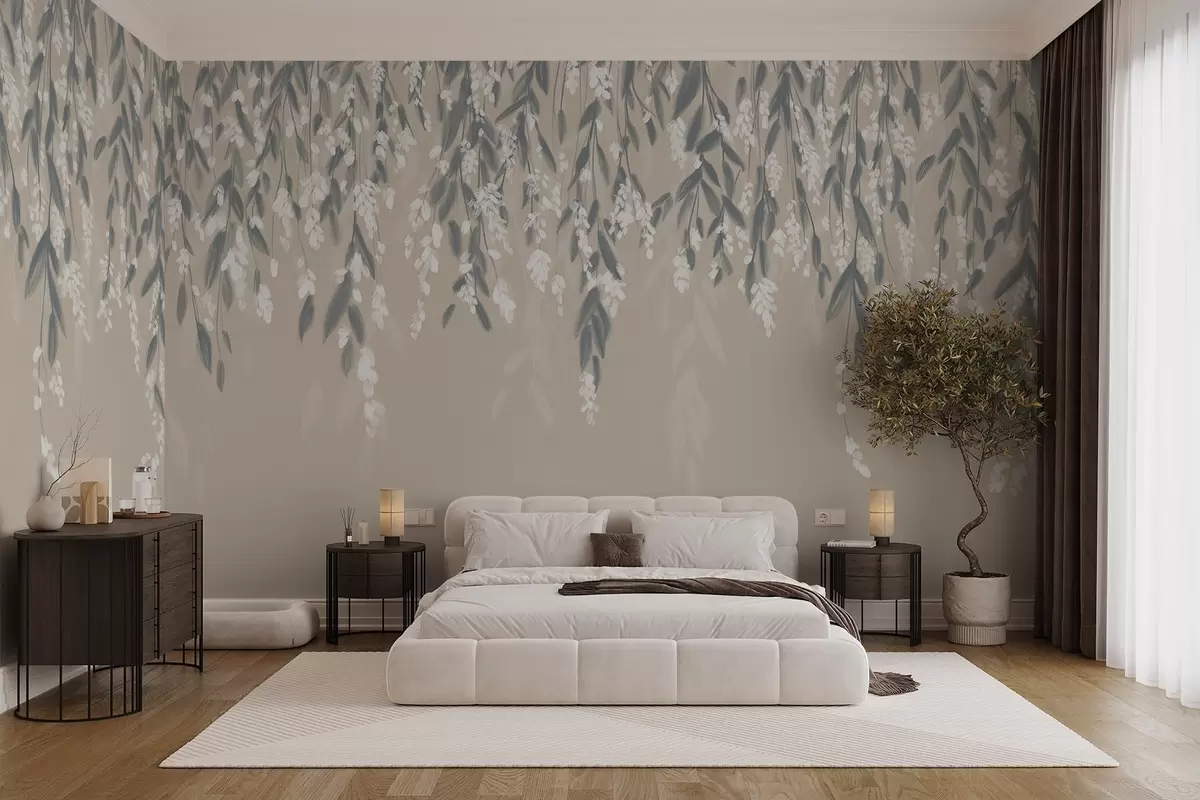 Fototapeta Kaskadowe gałęzie w odcieniach stonowanej zieleni z białymi kwiatami i liśćmi na beżowym tle Nr w08781