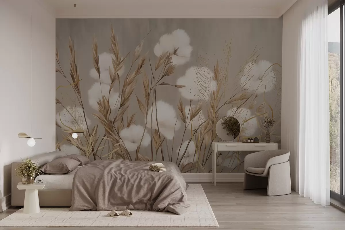 Fototapeta Miękkie, puszyste bawełniane białe kwiaty i wysokie pomarańczowe kłosy traw na stonowanym beżowym tle Nr w08784