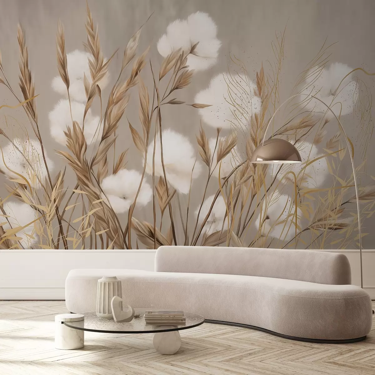 Fototapeta Miękkie, puszyste bawełniane białe kwiaty i wysokie pomarańczowe kłosy traw na stonowanym beżowym tle Nr w08784