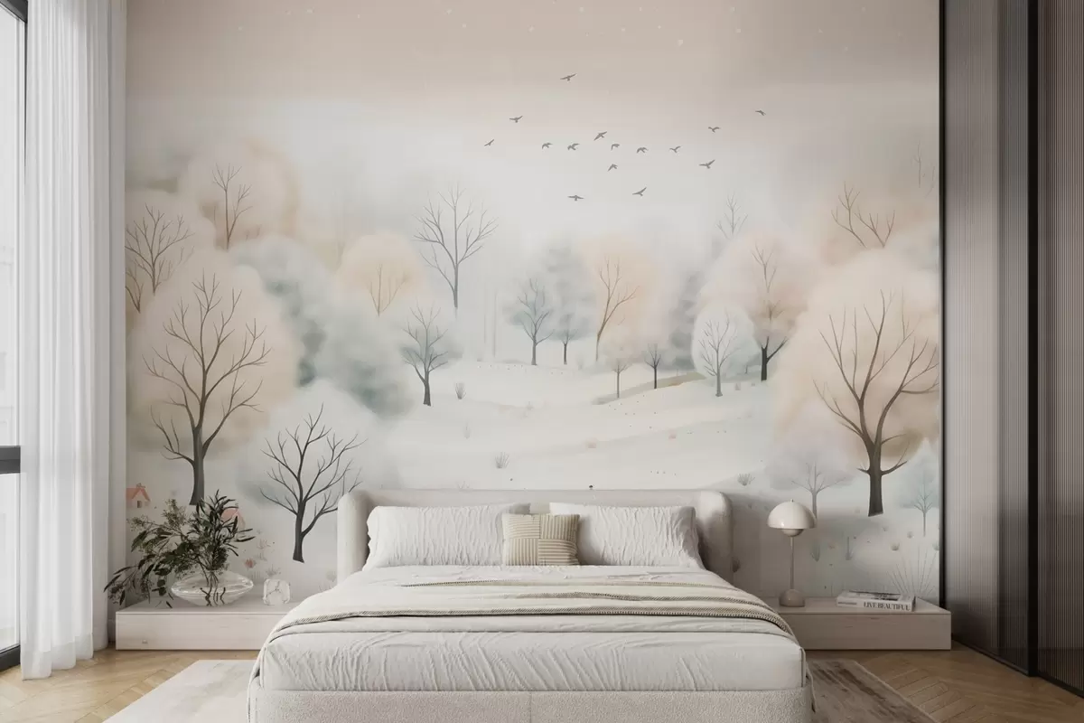 Fototapeta Zimowy las z drzewami, małymi domkami, ptakami i śniegiem w lekkim akwarelowym stylu Nr w08815