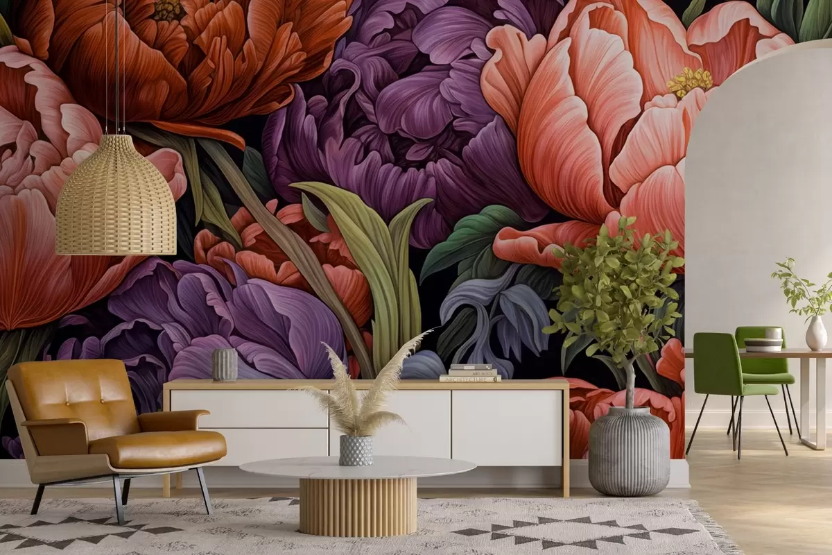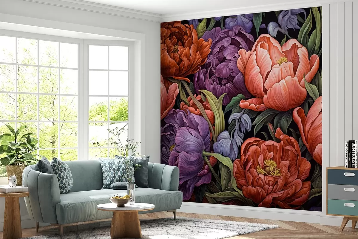 Fototapeta Tulipany i piwonie w stylu wiktoriańskim, w kolorach czerwonym i fioletowym Nr w08818v1