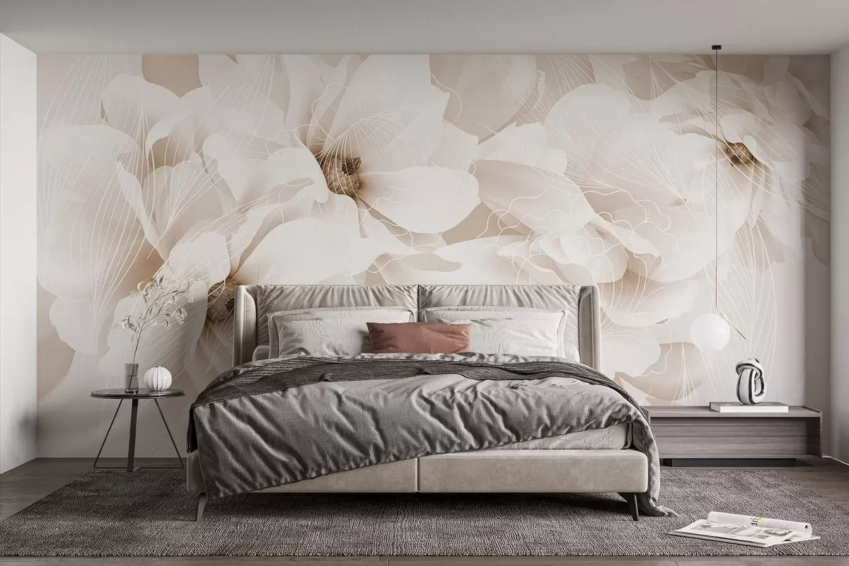 Fototapeta Pastelowe kwiaty piwonii z białymi i beżowymi delikatnymi płatkami i białymi liniami na jasnobeżowym tle Nr w08826v1