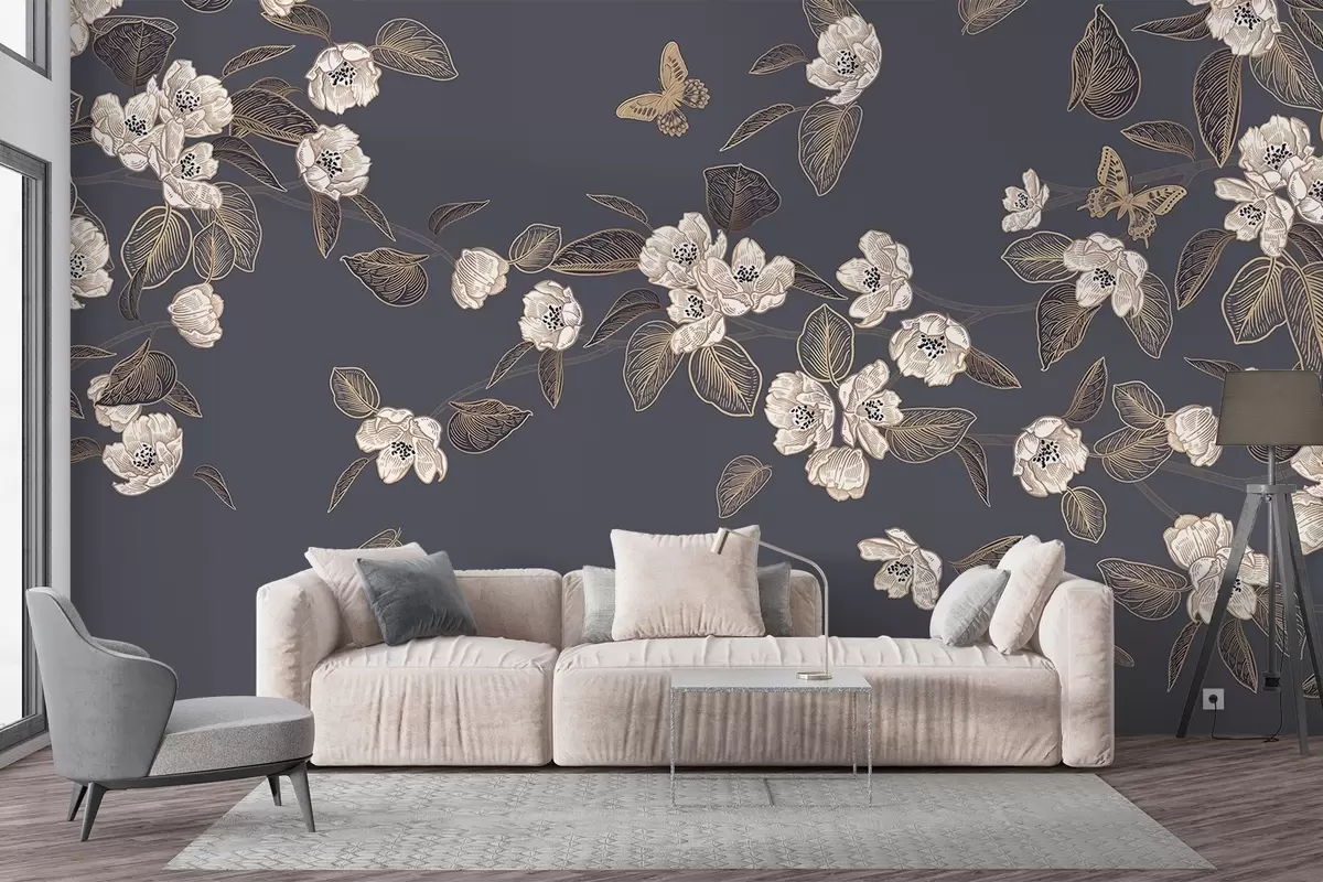 Fototapeta Gałąź kwitnącej wiśni z kwiatami, liśćmi, motylami na ciemnoszarym tle Nr w08830